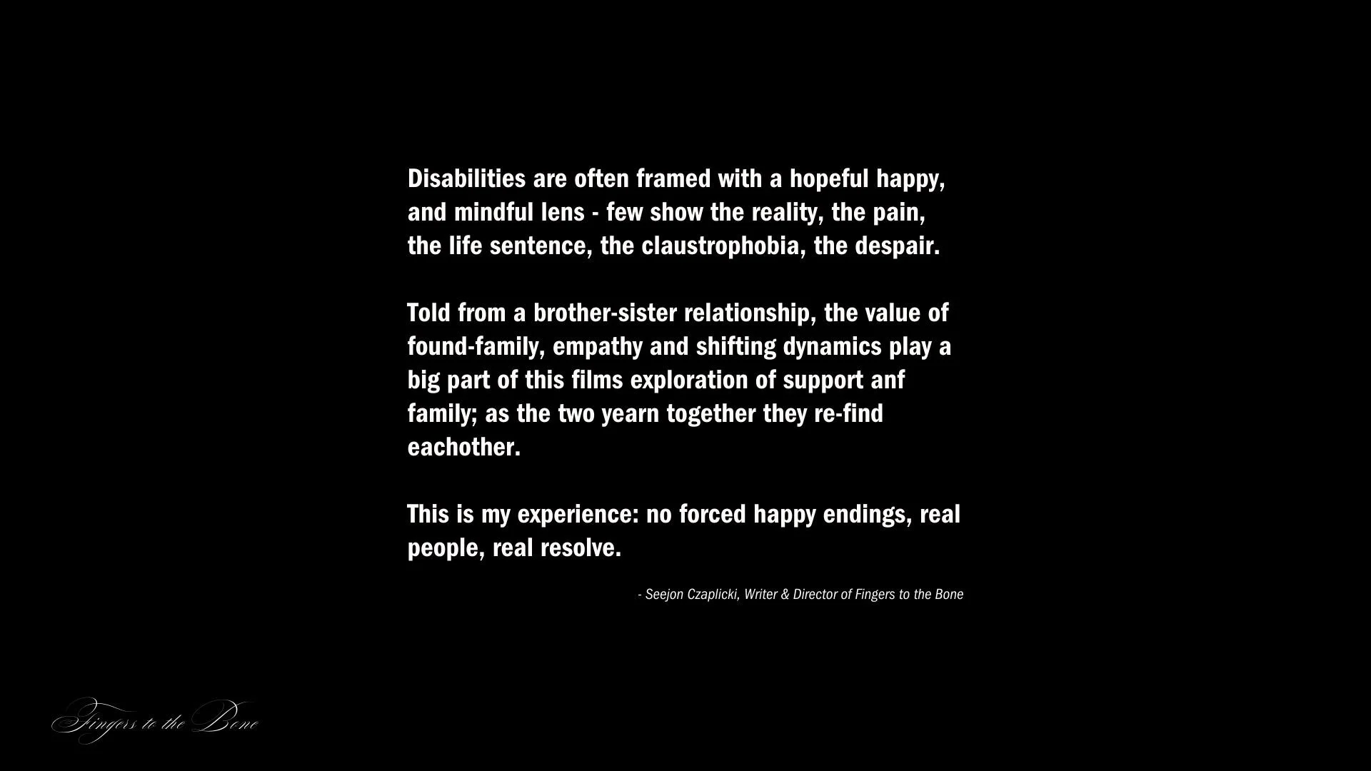 Fingers to the Bone disability/family drama 12 mins USA | 2026 In a quiet Midwest town, Marcy must connect with her adopted brother Sean—struggling with Tourette’s and years of distance—and convince him to face his family, his past, and their father’s birthday before the door closes. IN DEVELOPMENT